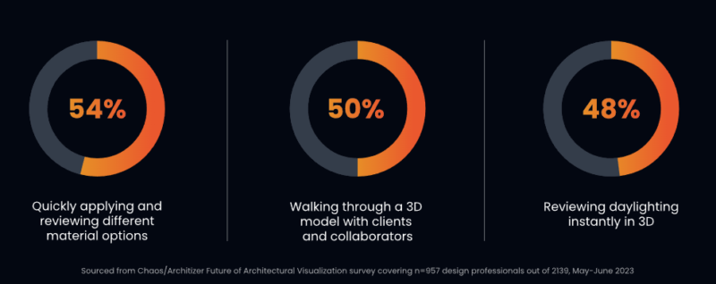 46% van de respondenten gaf aan dat tijdbesparing en het versnellen van het ontwerpproces een belangrijk voordeel voor hen was. Snel verschillende materiaalopties toepassen en beoordelen (gekozen door 54% van de respondenten), samen met klanten of medewerkers door een model lopen (50%), en direct daglicht in 3D beoordelen (48%) waren allemaal populaire keuzes die verband hielden met verhoogde efficiëntie.