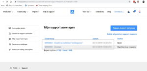 Klikken op “Mijn support requests” toont een pagina met links een menu met “Mijn support aanvragen”.