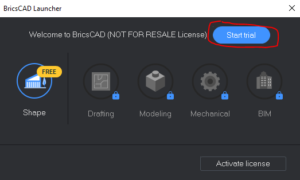 Als je de testversie van BricsCAD wilt gebruiken, klik dan op de blauwe knop “Start Trial”.
