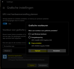 Afhankelijk van welke kaart je gebruikt, kun je ervoor zorgen dat SketchUp altijd de juiste grafische kaart gebruikt via de software van je kaart (NVIDIA Configuratiescherm, AMD Radeon-instellingen). Je kunt ook een specifieke grafische kaart toewijzen aan een applicatie in het gedeelte Beeldscherm van de Windows-instellingen.