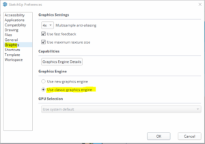 Klik op SketchUp –> Opties –> Hoge prestaties –> Opslaan